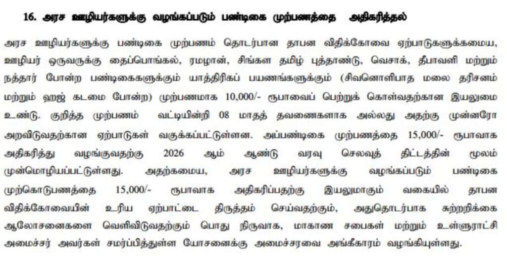 அரச ஊழியர்களுக்கான பண்டிகை முற்பணம் அதிகரிப்பு manel January 13, 2026 விசேட செய்தி அரசாங்க ஊழியர்களுக்காக வழங்கப்படும் பண்டிகை முற்பணத்தை 15,000 ரூபா வரை அதிகரிப்பதற்கு அமைச்சரவை அங்கீகாரம் வழங்கியுள்ளது. Share Now Facebook Twitter Linkedin Pinterest