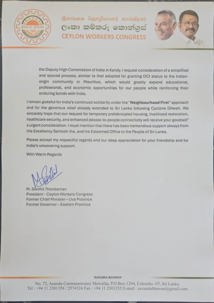 OCI அட்டையை பெருந்தோட்ட சமூகத்தினர் பெற்றுக் கொள்வதில் கடினமான நடைமுறைகள் இருப்பதால் அதை இலகுப்படுத்துவதுதற்கு பிறப்பு சான்றிதழில் இந்திய வம்சாவளி தமிழர் எனவும், அல்லது கண்டியில் உள்ள இந்திய உயர்ஸ்தானிகர் அலுவலகத்தில் இந்தியாவில் இருந்து வந்தமைக்கான ஆதாரங்கள் உள்ளமையால் அவற்றை ஆய்வு செய்து OCI அட்டை வழங்குவதற்கான நடவடிக்கை மேற்கொள்ளுமாறும் செந்தில் தொண்டமானால் கோரிக்கை முன்வைக்கப்பட்டது.