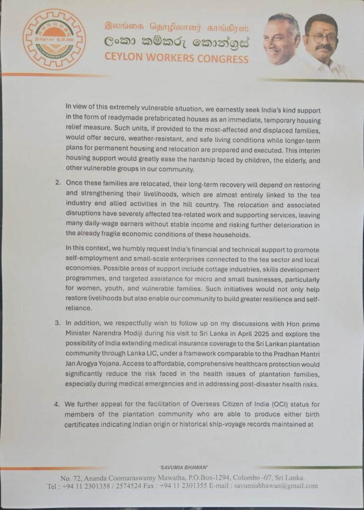 அனர்த்தத்தினால் பாதிக்கப்பட்ட மக்களுக்கு நிரந்தர வீடுகளை அமைத்து கொடுக்கும் வரை அவர்களுக்கான தற்காலிக வீடுகளை அமைத்து கொடுத்தல், தற்போது வசிக்கும் இடத்தில் இருந்து மாற்று இடத்துக்கு பாதிக்கப்பட்ட மக்கள் செல்லும் போது அவர்களுக்கு தொழில் ரீதியான பாதிப்புகள் ஏற்படும் ஆகையால் அவர்களுடைய வாழ்வாதாரம் பாதிக்காமல் இருப்பதற்கு அவர்களுக்கான நிதியுதவிகளை வழங்குதல், இந்திய பிரதமர் நரேந்தரமோடி இலங்கை வருகை தந்த போது இந்தியாவின் பிரதான் மந்திரி ஜன் ஆரோக்கிய யோஜனா திட்டத்தின் கீழ் வருடாந்தம் இலங்கை மதிப்பில் 18 இலட்சம் ரூபா மருத்துவ காப்பீடு வழங்குவதை போல், LIC Lanka நிறுவனத்தின் ஊடாக இந்த திட்டத்தை அறிமுகப்படுத்தி பெருந்தோட்ட சமூகத்தை அதில் உள்ளடக்குமாறு கோரிக்கை விடுக்கப்பட்டது.