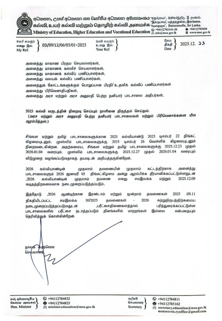 2026 ஆம் ஆண்டு கல்வி ஆண்டின் முதலாம் தவணையின் முதல் கட்டத்திற்காக அனைத்துப் பாடசாலைகளும் 2026 ஆம் ஆண்டு ஜனவரி 5 ஆம் திகதி திங்கட்கிழமை தொடங்க திட்டமிடப்பட்டுள்ளதாக கல்வி அமைச்சு விடுத்துள்ள அறிக்கையில் தெரிவிக்கப்பட்டுள்ளது.