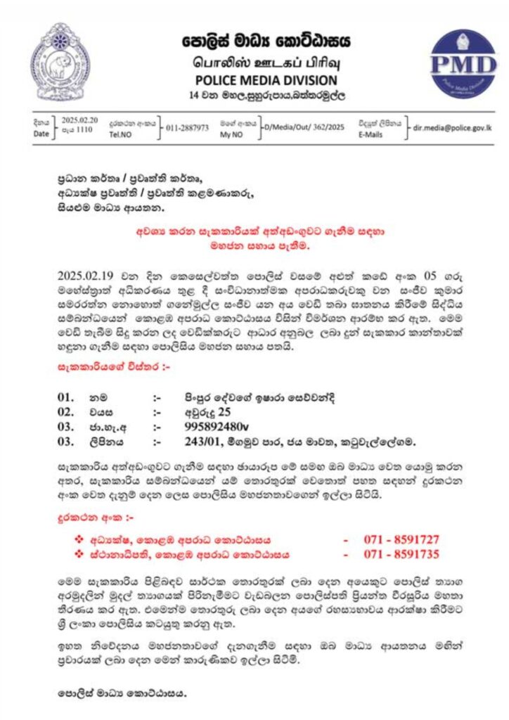 சம்பந்தப்பட்ட பெண்ணைப் பற்றிய தகவல் தெரிந்தால் கீழுள்ள தொலைபேசி இலக்கத்திற்கு அறிவிக்குமாறு பொலிஸார் கேட்டுக்கொண்டுள்ளனர்.